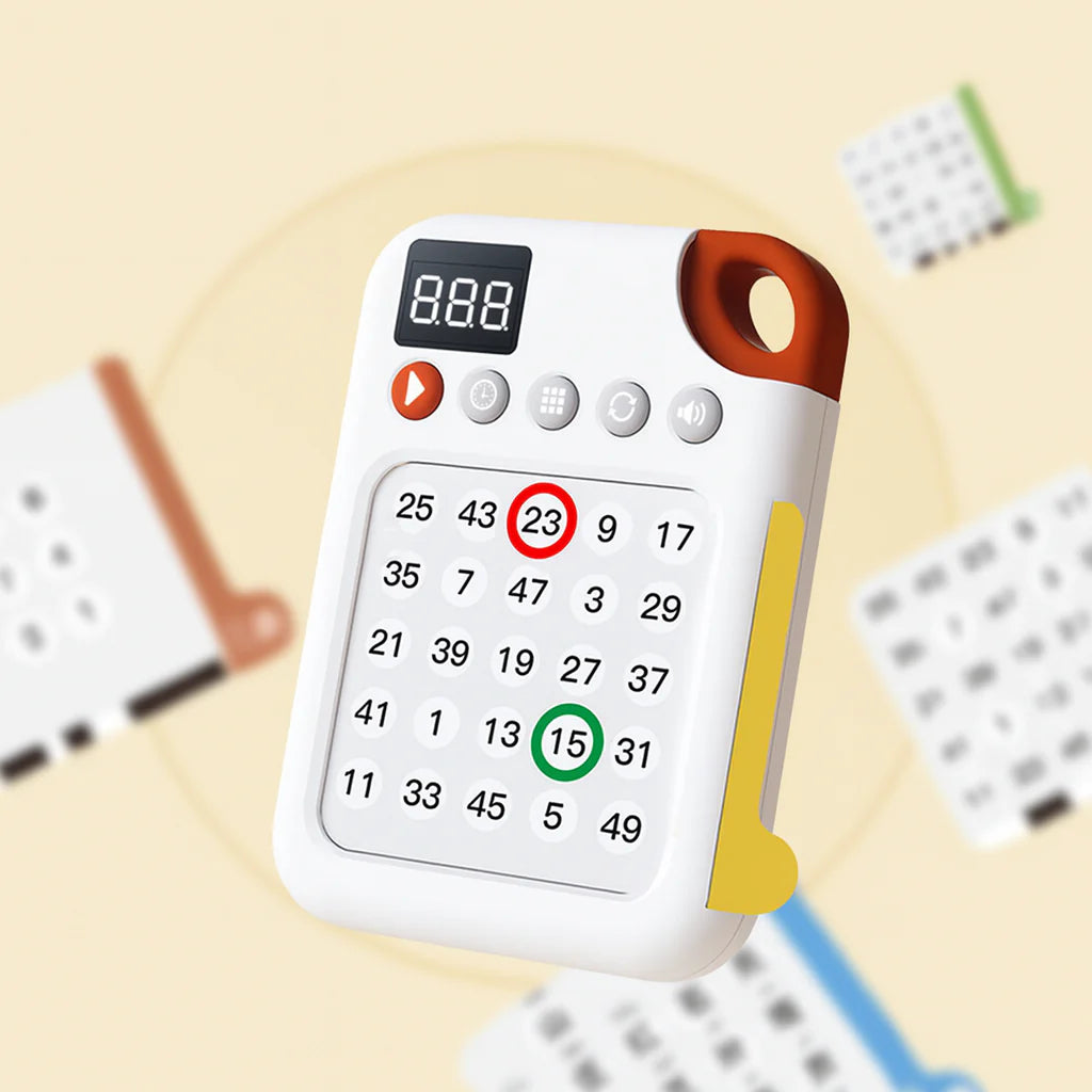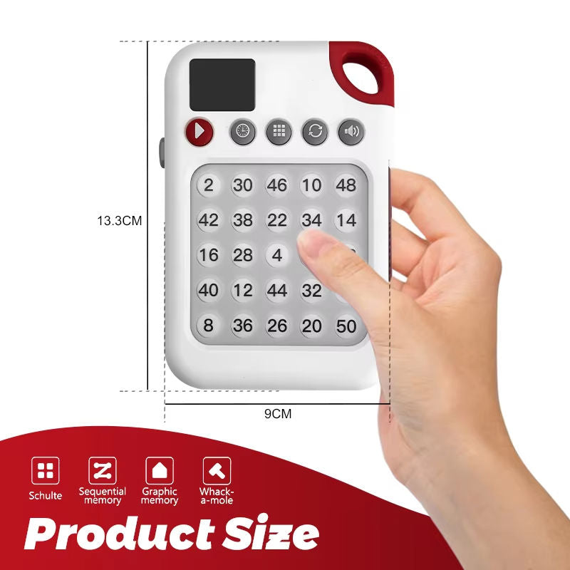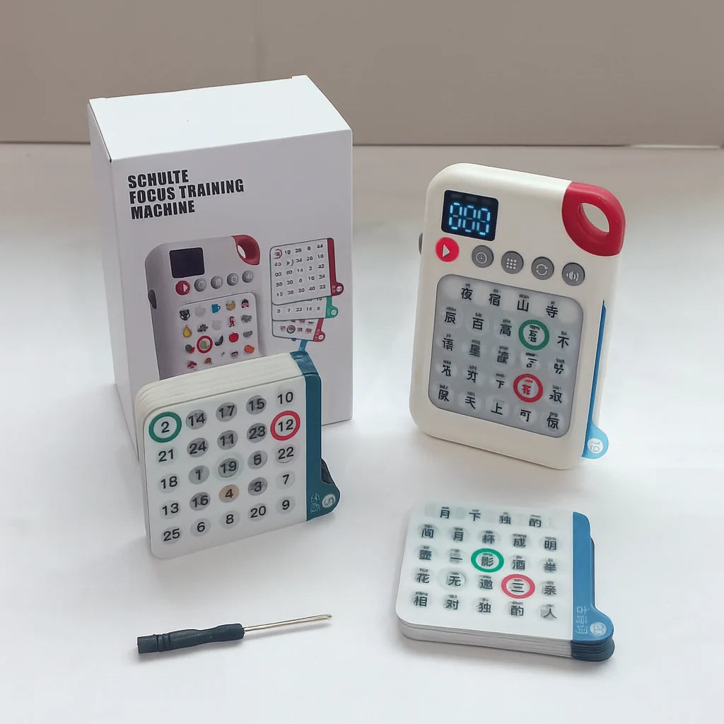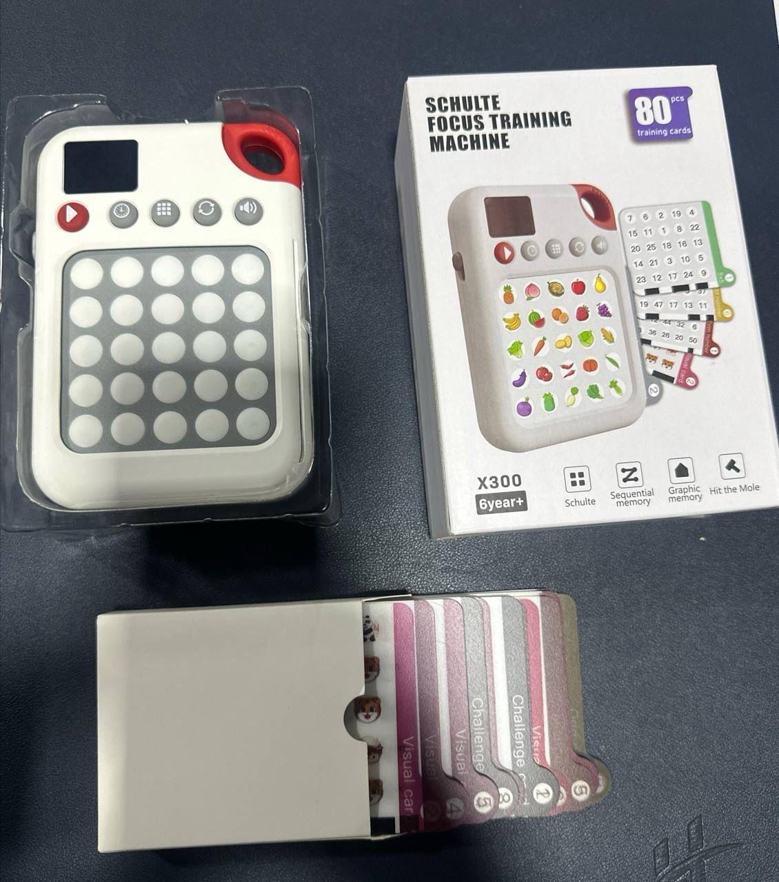 The device uses number and image-based challenge cards to train visual memory, reaction time, and pattern recognition — essential for developing stronger focus.