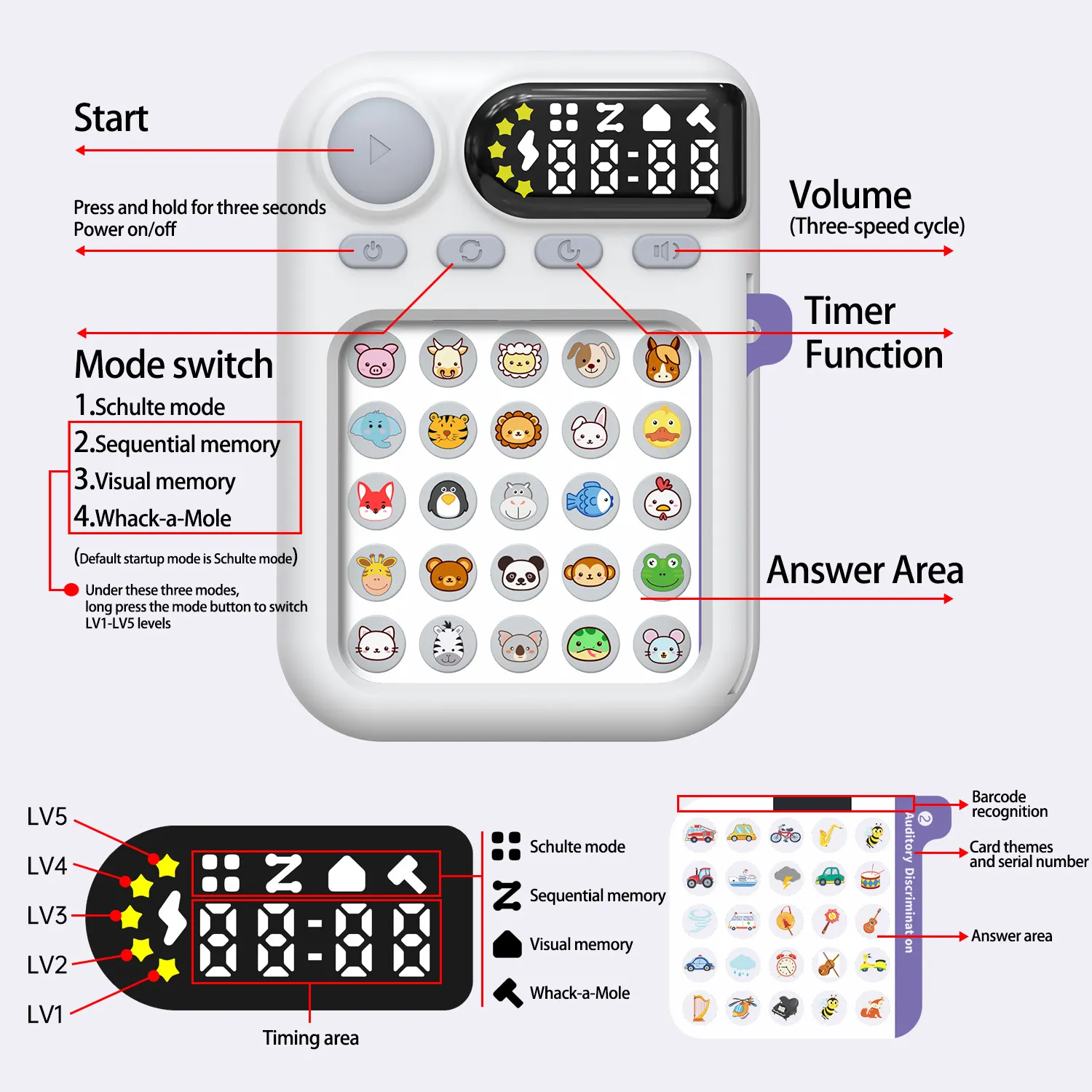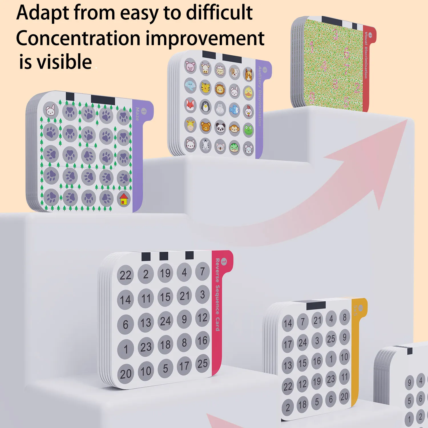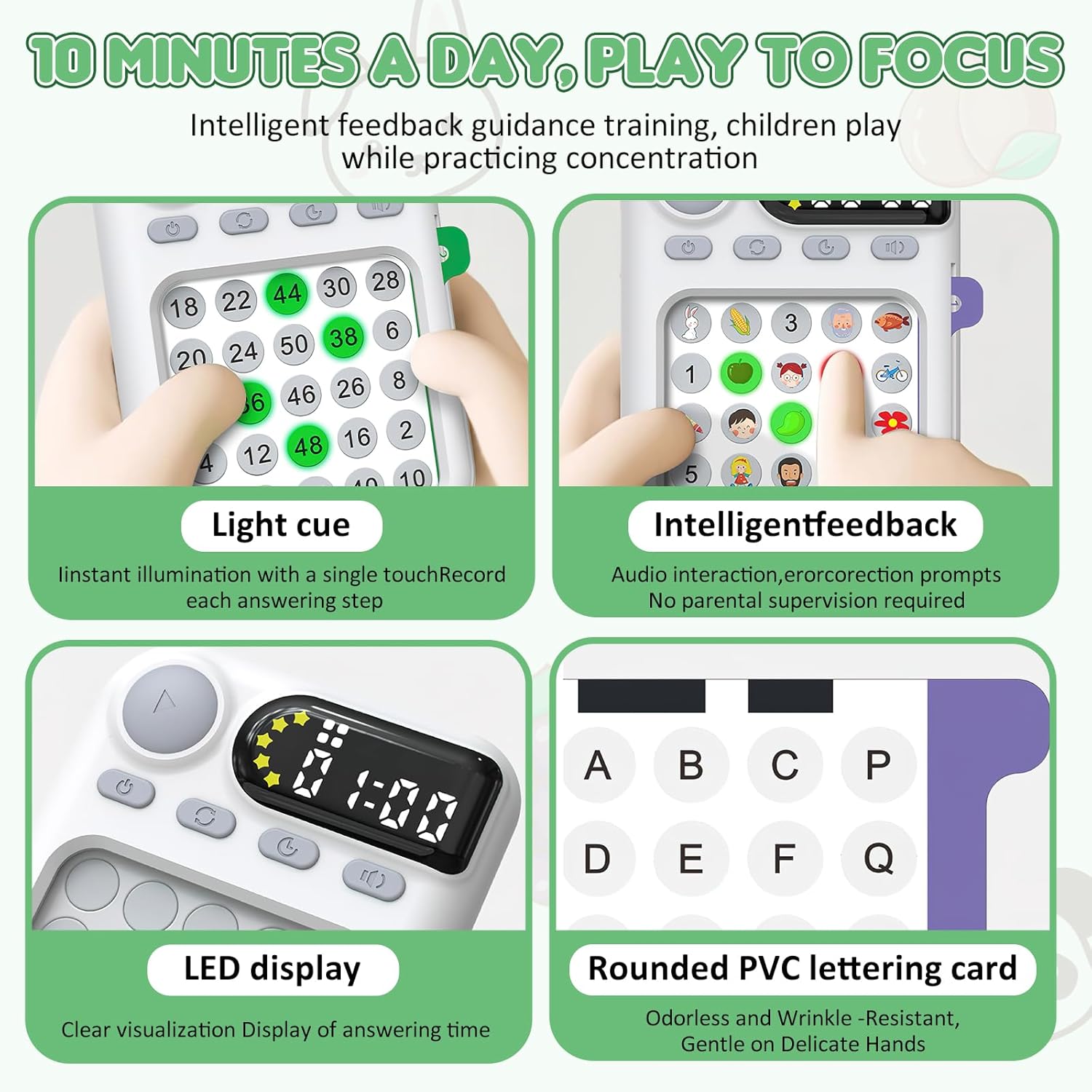 The device uses number and image-based challenge cards to train visual memory, reaction time, and pattern recognition — essential for developing stronger focus.